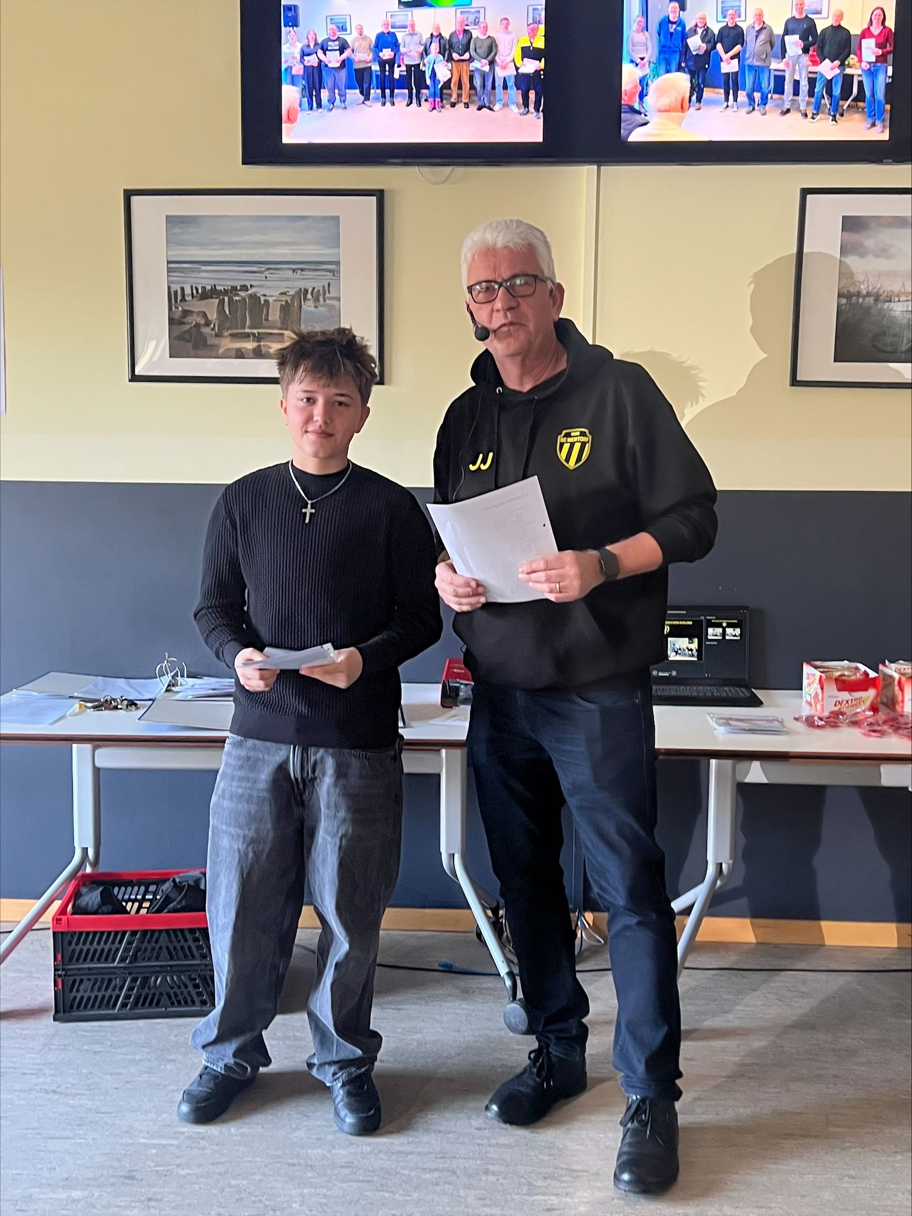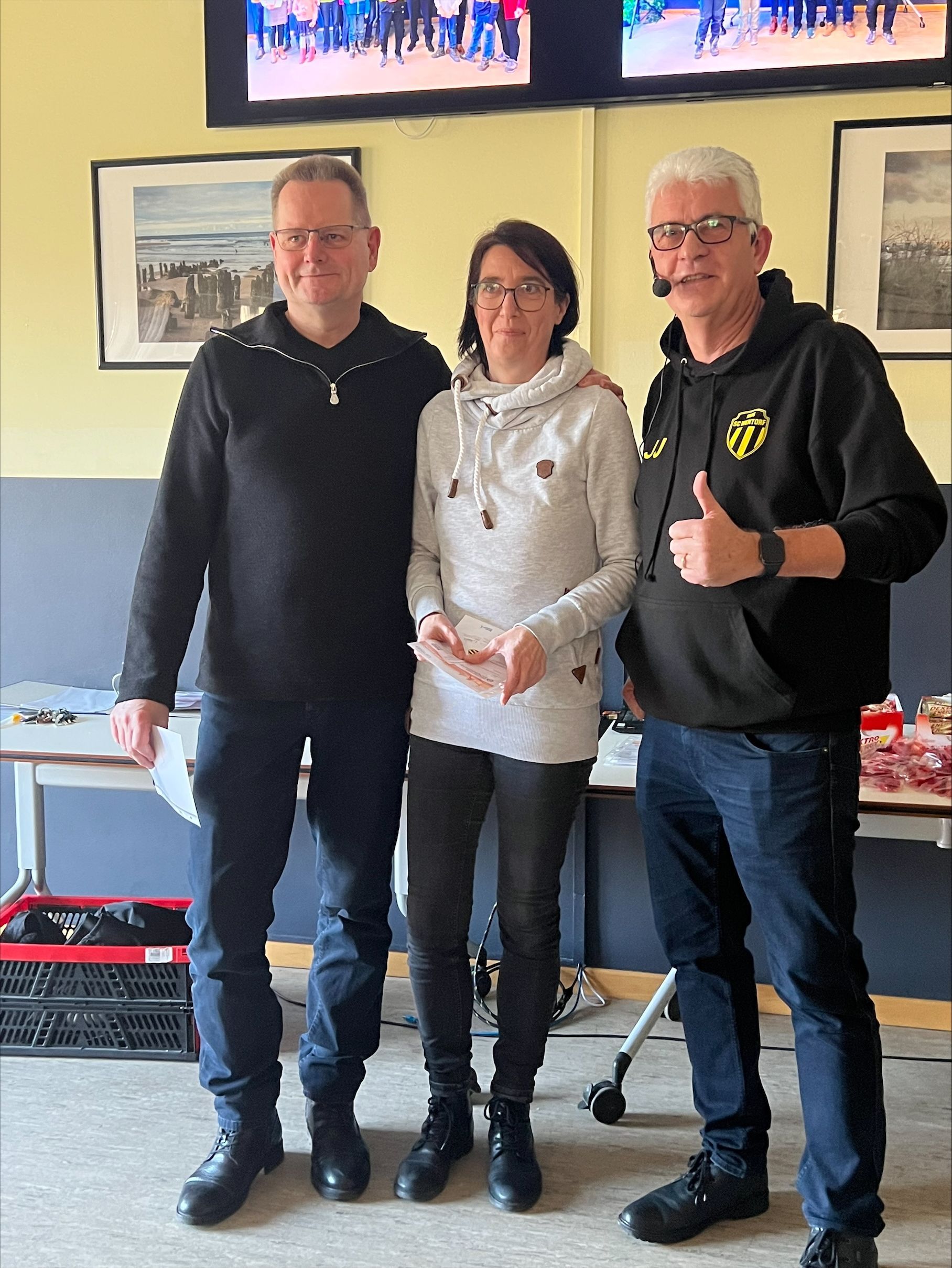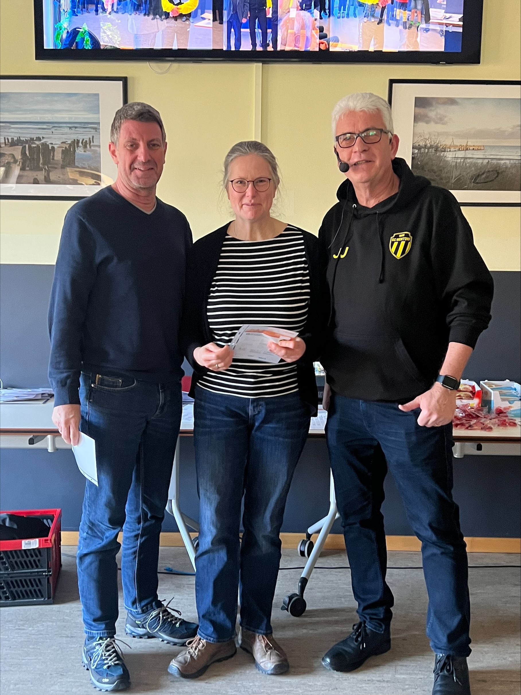 Die Sport- und Jugendwartin Peggy Rateike-Peters und der 2. Vorsitzende Helge Müller unterstützten Johannes Jung bei der Ehrung und verteilten Getränkegutscheine an die Geehrten.