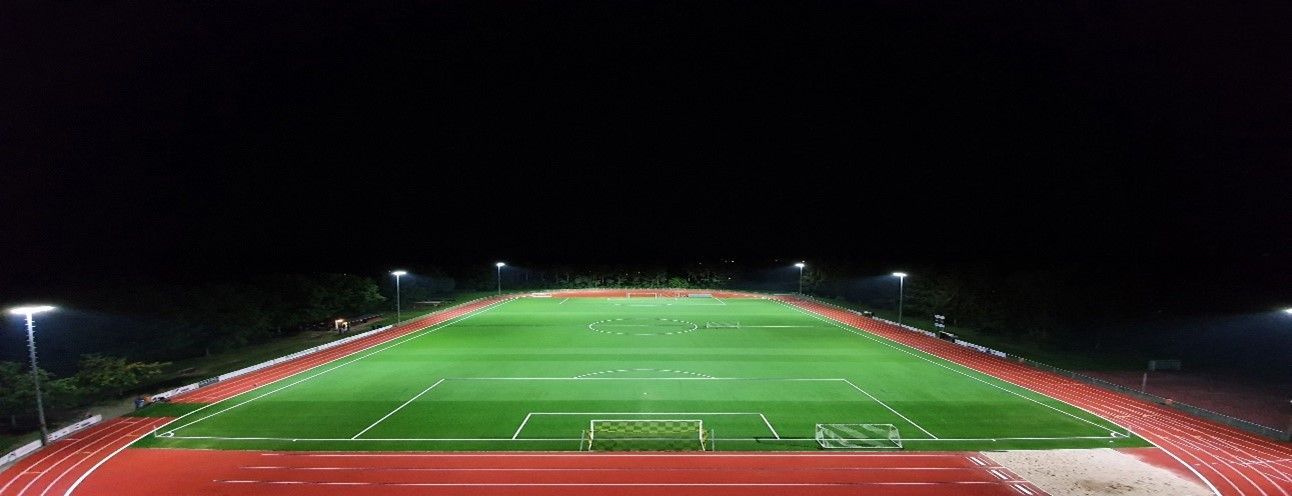 Mit nur 12 statt bisher 14 Leuchten erreichen wir Energieeinsparungen von rd. 59% und damit indirekt auch CO2 Vermeidung, geringere Lichtimmissionen durch gezielte, bedarfsgerechte Steuerungstechnik sowie eine Erhöhung der Qualität des Trainings- und Wettkampfbetriebes. Wir können nun in Sekundenbruchteilen per App, die Beleuchtung an der Stelle einsetzen, wo und in welcher Stärke sie benötigt wird. Dabei haben wir auch an die Leichtathleten gedacht. Als einer der ersten Sportvereine im Hamburger Umland, können wir nun die Leichtathletikbereiche der Anlage separat ausleuchten. Laufbahn rechts, Laufbahn Links, nur die Tartanbahn (400 m Bahn), Weitsprung, Hochsprungfläche. Die Fußballer können nun auch Platzhälfte links oder rechts, Trainingsbetrieb, Spielbetrieb oder Grundbeleuchtung schalten, ohne den Leichtathletikbereich ausleuchten zu müssen. Für die optimale Ausleuchtung in der dunklen Jahreszeit ist somit gesorgt.